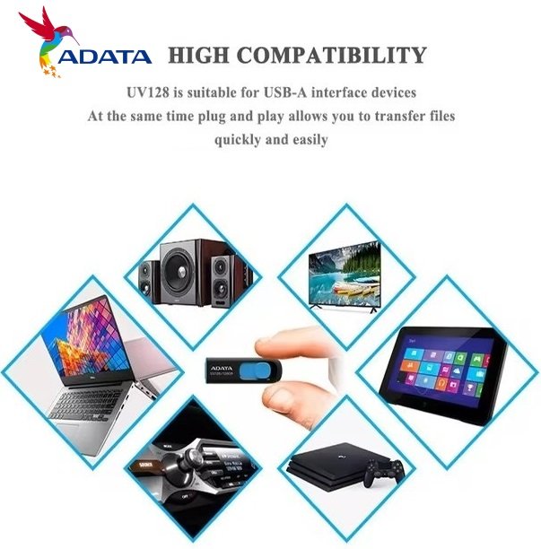 The ADATA UV128 USB Flash Drive offers a stylish design, reliable performance, and high-speed transfers. With its USB 3.2 interface, you can move files faster than ever before. It features a slide-out USB connector that protects it when not in use, eliminating the need for a cap. Compact, durable, and easy to use, it’s the perfect choice for students, professionals, and everyday users.